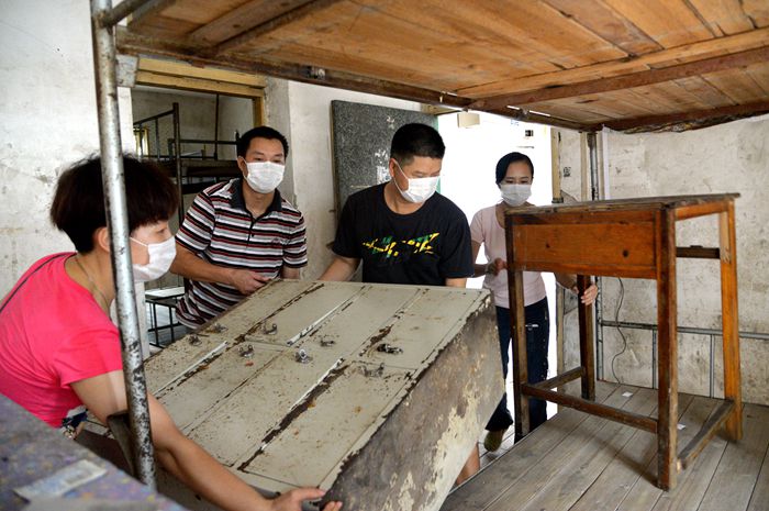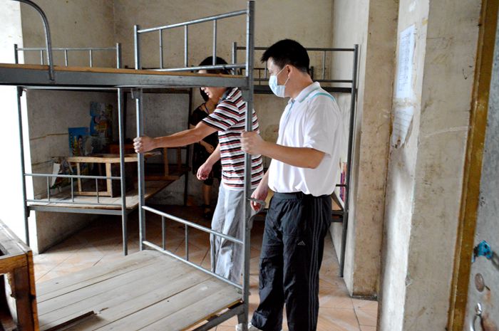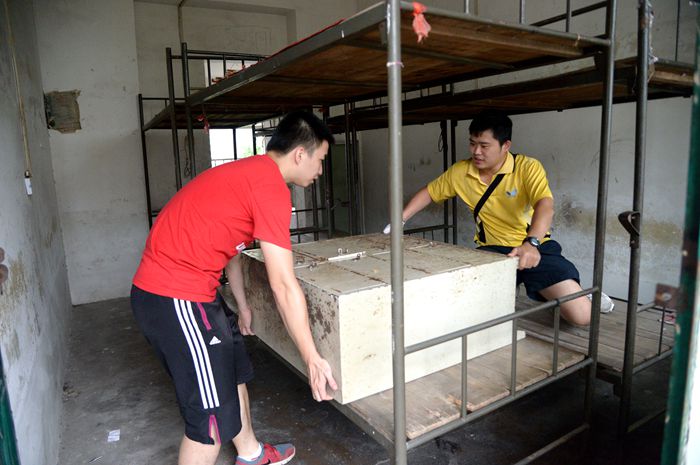 學院譚勁濤院長助理與黨員教師整理學生宿(xiǔ)舍床架
