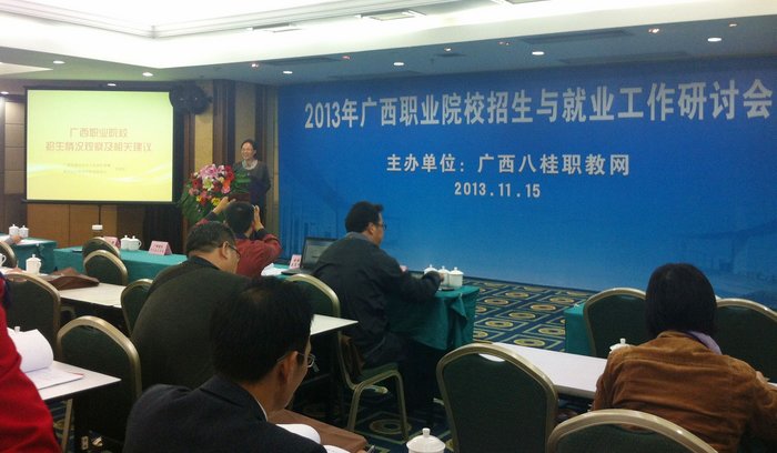 為促進我區中、高職院校(xiào)的(de)交流與合作,搭建資源共享平台,拓寬招生就業渠道。11月15日,由廣西八桂職教網承辦的“2013年廣西職業院校招(zhāo)生與就業工作研討會”在南寧(níng)召開。我(wǒ)院(yuàn)招生就業處楊波主任和部(bù)門相關人員參加了此次會議。