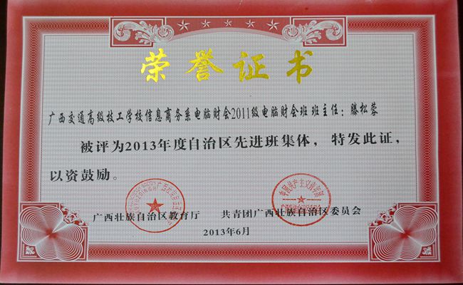 2011級電腦(nǎo)財會班被評為2013年(nián)度自治(zhì)區先進班集體