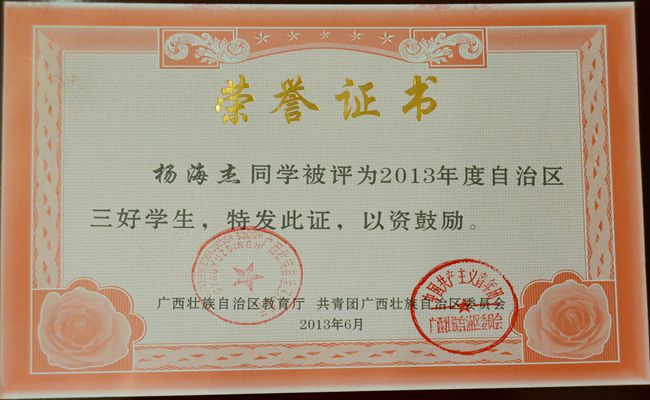 楊海(hǎi)傑同學被評為2013年度自(zì)治區三好學生