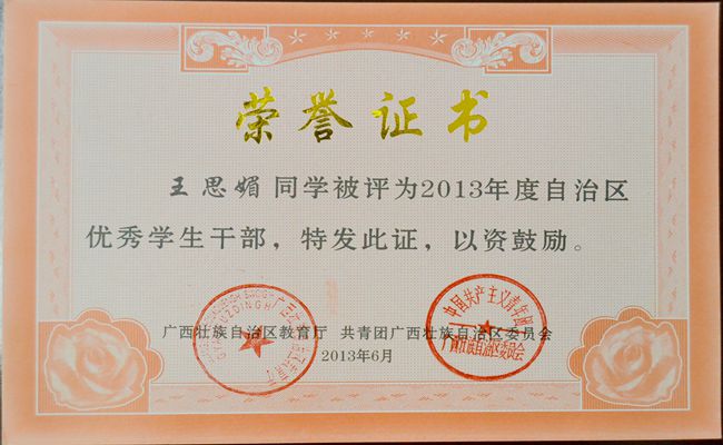王思媚同學被評為(wéi)2013年度自治區優秀學生(shēng)幹部