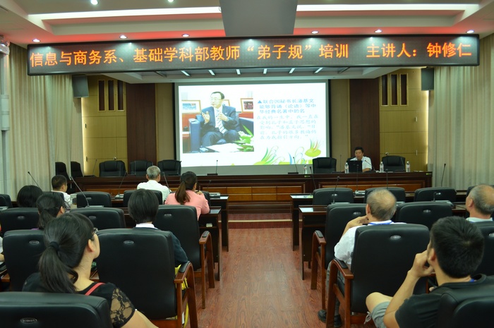 學習和踐行《弟子規》是(shì)我院的德育教育工作的特色,是國家示範校建(jiàn)設中(zhōng)特色項目(mù)的內容。1016日,我院信息與商務係、基礎學科部的全體老師在信息中心會議室進行《弟子規》傳統(tǒng)文化(huà)學習,由(yóu)學院副院長、《弟子規》講師團團(tuán)長鍾修仁(rén)主講。