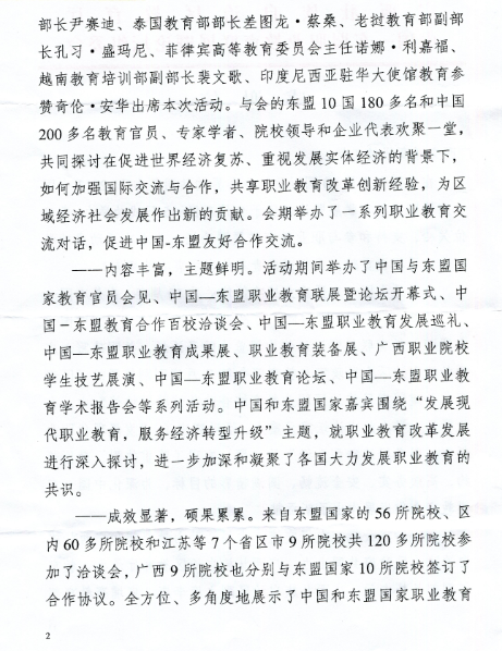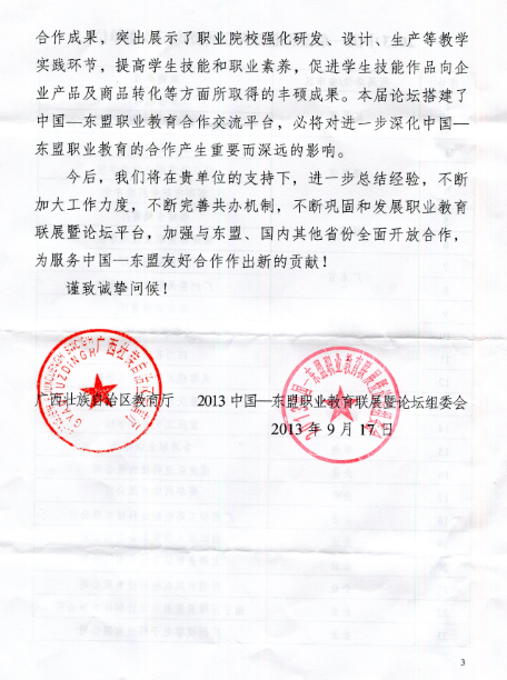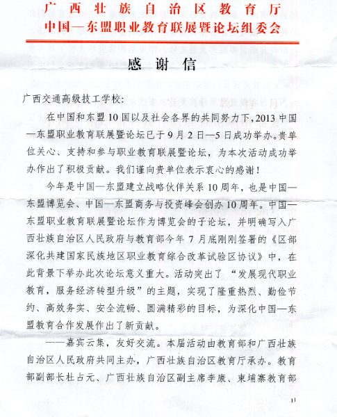 自治區教育廳與中國—東盟職業教育聯展暨論壇組委會(huì)向我院致謝