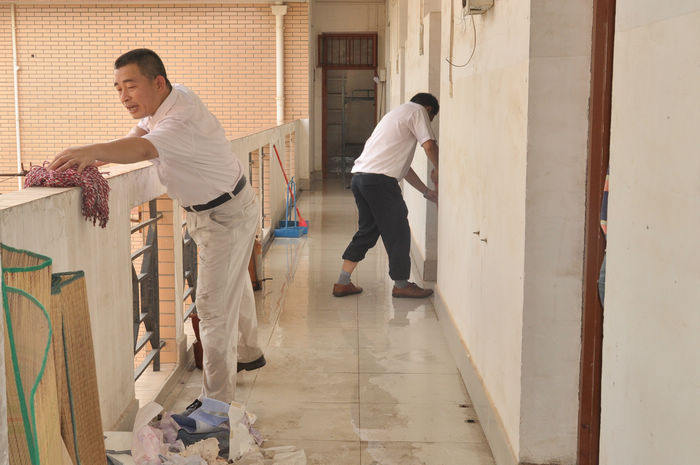 陸天雲副院長在清(qīng)掃高(gāo)峰校區辦公室窗戶