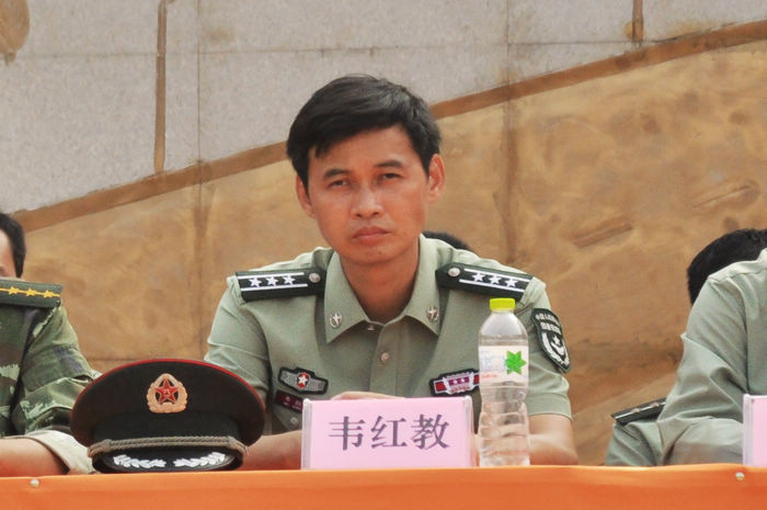 廣(guǎng)西預備役(yì)師裝備部上校、學院院長韋紅教在廣西武警(jǐng)一支隊隊長(zhǎng)覃(tán)振周的陪(péi)同下檢閱各(gè)支方隊