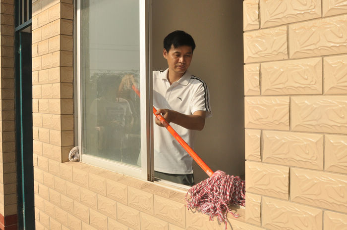 陸天雲副院長在清掃高峰校(xiào)區辦公室窗戶