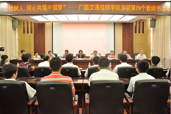 910日下午,在第29個教師(shī)節到來之際(jì),我院在信息中(zhōng)心多功能會議室舉行主題為“立德樹人,同心共(gòng)築中國夢”的慶祝暨表彰大會。自(zì)治區交通運輸廳科教處(chù)處長岑(cén)春,自治區道路運輸管理局黨委(wěi)書記孫永生,自治區交通運輸廳科教處副處長韋揚、副調研員張迎春(chūn),自治區道路運輸(shū)管理局黨委辦公室主任王(wáng)愛(ài)君、職業技能(néng)管理科科長肖三亮、人事科副科長劉亮等領導出席大會,為我院教職工帶(dài)來親切慰問,並為獲獎教師頒獎。大會由我院黨委書記羅華主持。