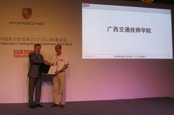 保時捷(中國)實習生培(péi)養2012-2013年度會議於2013年8月28-29日在中國古城(chéng)西安萬達希爾頓酒(jiǔ)店隆重舉行。參(cān)加會議的有保時(shí)捷(中國)培(péi)訓學院高級經理費傑先生、保時捷(中國)服務培(péi)訓經理吳珂先生、保時捷(中國)學徒(tú)項目專員(yuán)李衡先生,全國保時捷校企合作院校領導代表及來自(zì)全國各地43家保時捷中心的經(jīng)理等100多人。會議由保時捷(中國)服務培訓經理吳珂(kē)先生主持。此次會議的主要內容是總結過去(qù)一年來保時捷(中國)校(xiào)企合作項(xiàng)目所(suǒ)取得的(de)成績和經驗,並簡要介紹了該項目2014年度工作計劃。
