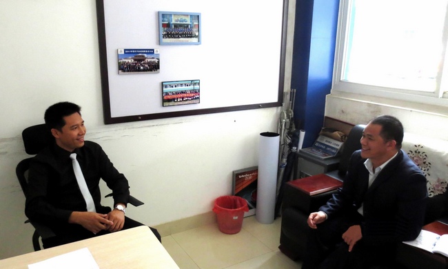 圖5   梁振華副主任向北京現代(dài)桂林順景特約銷售服務店技(jì)術總監全石健了解畢業生工作情況
