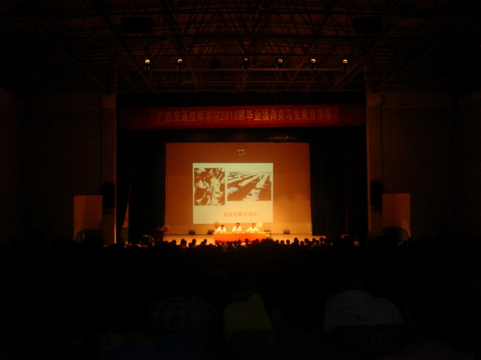 為了推動2013屆畢業生頂崗實習及就業推薦工作,學校(xiào)於2012年(nián)528日晚上7:20分在學校大禮堂召開(kāi)2013屆畢(bì)業生頂崗實習暨就業動員大會。大(dà)會由學校鍾修仁副校長主講,招生就業處楊波主任、孫祖(zǔ)德副主任、全體2013屆近1400名畢業生及班主任參加了動員大會.大會由招生(shēng)就業處楊波主任主持。