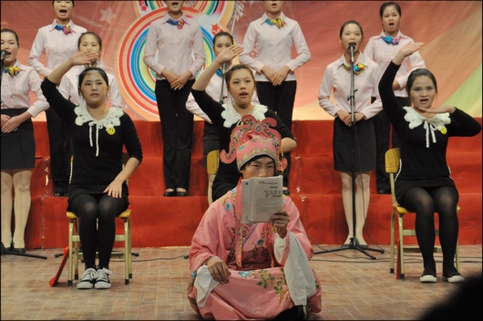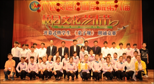 20111123,學校第八屆校園文化藝(yì)術節開幕暨《弟子規》朗誦比賽決賽在學校大禮堂隆(lóng)重舉行,校長韋(wéi)紅教,副校(xiào)長陸天雲、鍾修仁、關菲明,校長助理譚勁濤出席開(kāi)幕(mù)式,學校中層領導幹(gàn)部及全體教職員工參加了開幕式(shì)。副校長鍾修仁在開幕(mù)式上致詞,隨後,校長韋紅教宣布校園(yuán)文化藝術開(kāi)幕,拉開了競賽的帷幕。2010級、2011級共13個班級在決賽中展示風采(cǎi)。