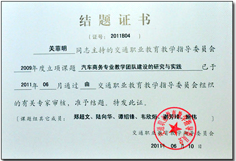熱烈祝賀由關菲明副校長主持的,交通職業教育教學指導委員會2009年(nián)度立(lì)項的省部級課題——《汽車商(shāng)務專業教學團隊建設的研究與實踐》,經過課題組的全體成員鄭超文、陸向華、譚紹鋒、韋(wéi)欣烜、謝芳玲等同誌的努力,於2011年6月10日通過專(zhuān)家審(shěn)核,順(shùn)利結題。