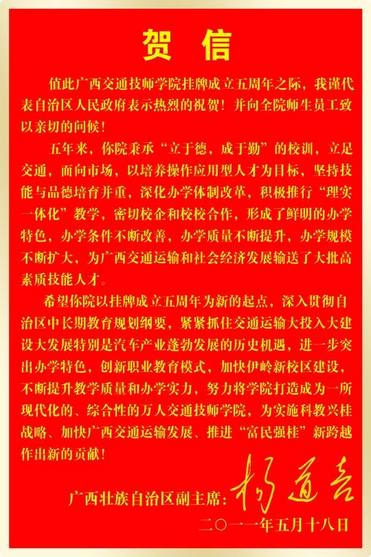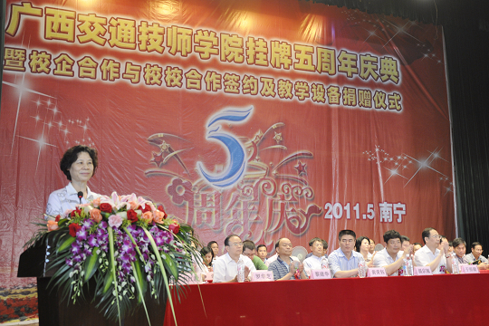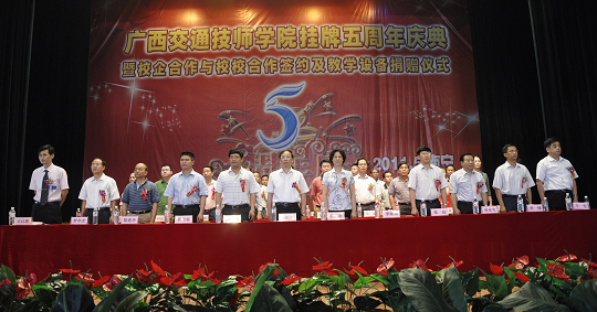 在這歡(huān)欣鼓舞的日子裏,上級主管部門及領導對我校五年來的發展成就給予了高度(dù)評價,新聞(wén)媒體(tǐ)和社會各界也(yě)對我校五年來的辦(bàn)學成果給予了高度關注。自治區副主席楊道(dào)喜向我校發(fā)來賀信,自治區交通(tōng)運輸廳黨組書記黃華寬為我校題詞,自(zì)治區交通運輸廳廳(tīng)長潘巍也(yě)為我校發來寄語。同時,自治區人力資源和社會保障(zhàng)廳副廳(tīng)長於祖毅、自(zì)治區交通運(yùn)輸廳副巡視員黃小幸、廣西(xī)陸軍預備役步兵師首長、自治(zhì)區道路運(yùn)輸管理局孫永生書記等領導以(yǐ)及各合作企業、院校、全(quán)區80所中學代表(biǎo)和各友鄰共建單位的領導、嘉(jiā)賓歡聚一堂,與我校(xiào)全體教職員工共同見證“五周年慶典”的美好時刻。