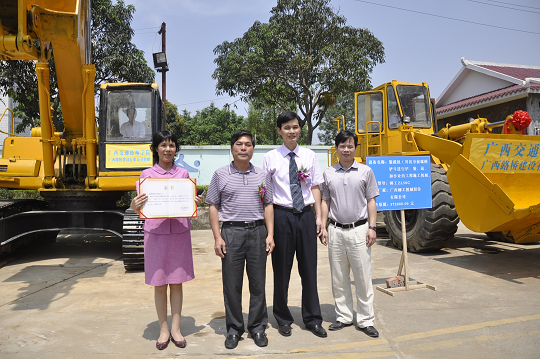 10時50分,教學(xué)設備捐贈儀式如期舉行。廣西(xī)路橋建設有限公司向我校捐贈了原值271.8萬(wàn)元的教學設備(挖掘機、裝載機、推土機、壓路機各一台(tái))。韋紅教院長與廣西路(lù)建公司(sī)何崇雄總經理現場(chǎng)交換了(le)捐贈牌匾與證書,雙方熱情而友好(hǎo)地握手將現場的氣氛推向了又一個高潮。
