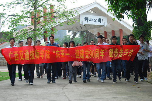 為迎接(jiē)“五一(yī)”國(guó)際勞(láo)動(dòng)節,慶祝建黨九十周年,激發職工的健身鍛煉熱情,2011年4月29日下午,91.com高級技工學(xué)校工會組織(zhī)全院教職員工在南寧市獅山公園開展了(le)“慶五一、迎建黨九十周年”健步走活動。