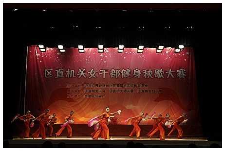 圖五:區直機關女幹部健身秧歌大賽(sài)頒獎典禮。我校(xiào)代表自治區交通運輸廳在(zài)大賽中榮獲二等獎,前排左四為我(wǒ)校劉飛英老師。
