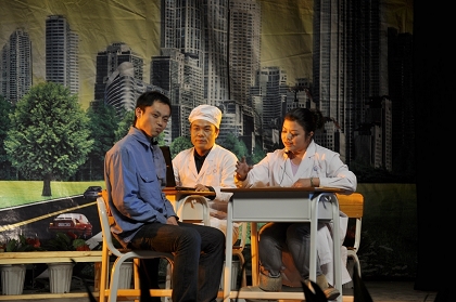 圖八:小品 《看病》劇照  表(biǎo)演者:汽車機電係 黎曉耘、勞(láo)一民、蔣濟隆老師