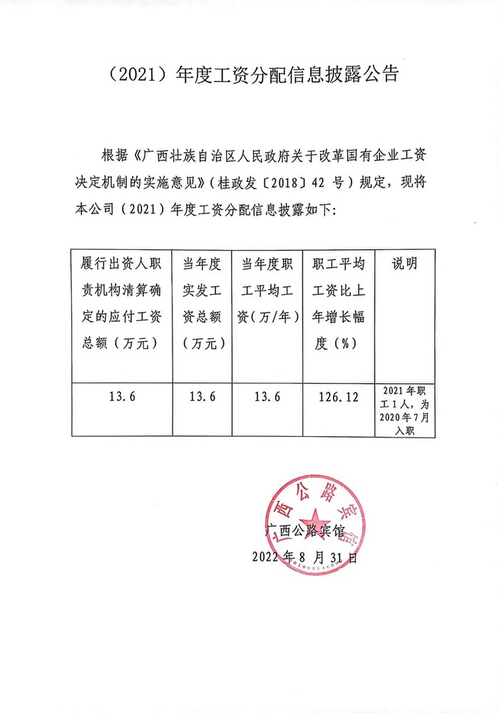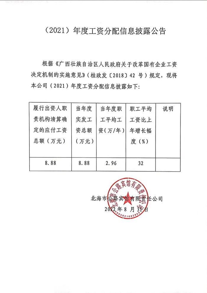 1.北海公路賓館有限責任公司2021年度工資分配信息披露公告
