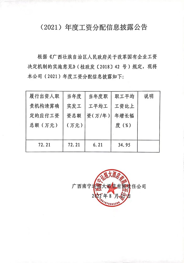 6.廣(guǎng)西南寧運招大酒店有限責(zé)任公司(sī)2021年度工資(zī)分(fèn)配信息披露公告