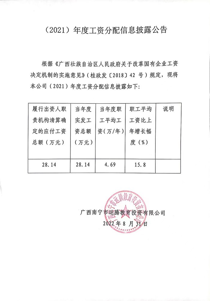 5.廣西南寧市運騰教育投資有限公司2021年度工資分配(pèi)信息披露公告