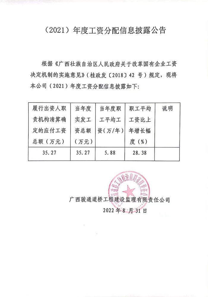 3.廣西駿通(tōng)道橋工(gōng)程建(jiàn)設監理(lǐ)有限責任公司2021年度工資分配(pèi)信(xìn)息披露公告(gào)