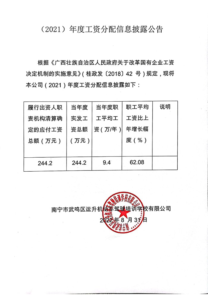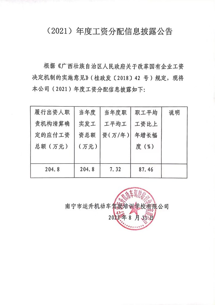 9.南寧(níng)市運升機(jī)動車駕駛培訓學校有限公司(sī)2021年度工資(zī)分配信息披露公告