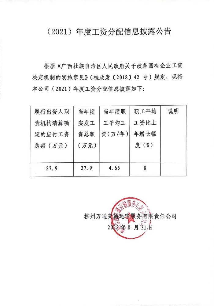 7.柳州萬通交通運輸服務(wù)有限責任公(gōng)司2021年度(dù)工資分配信息披露公(gōng)告