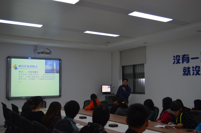 12月12日,我院信息與(yǔ)商務係邀請喜相逢大酒店(四星(xīng)級)銷售總(zǒng)監藺寶東到我院為13級旅遊與酒店管理專業的學生進(jìn)行專業授(shòu)課。