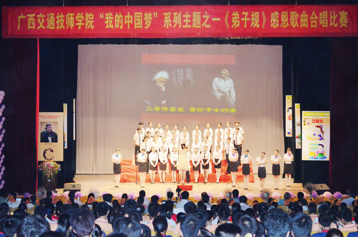 “古聖先賢孝為宗,萬善之門孝為基。禮敬尊親如聖賢,成就生命大意(yì)義(yì)……”在清新的曲調中,我(wǒ)院“我的中國夢”係列主題之(zhī)一《弟子規》感恩歌曲合唱比賽於6月6日晚在學院(yuàn)禮堂精彩上演。學(xué)院羅華書記、鍾修仁副(fù)院長、關菲明副院長以及有(yǒu)關(guān)部門負(fù)責(zé)人參加了此次活動,禮堂(táng)內(nèi)燈光璀(cuǐ)璨,座無虛席。