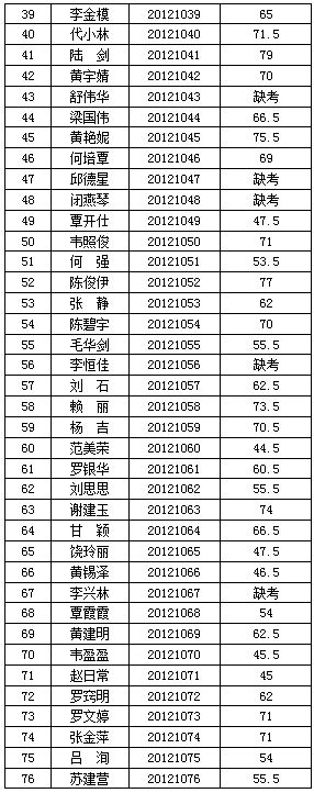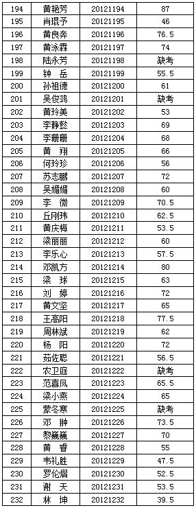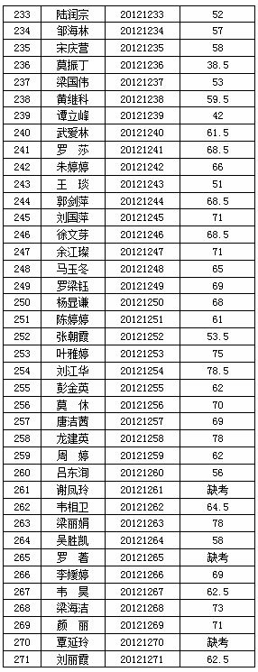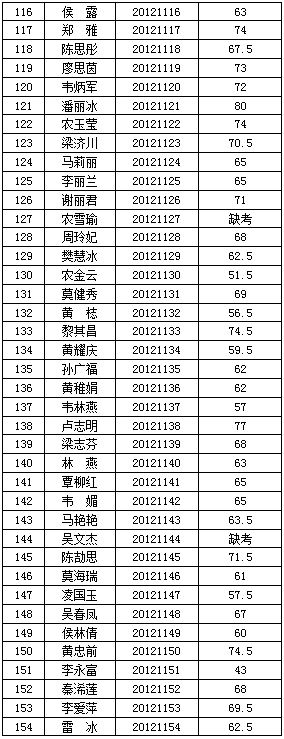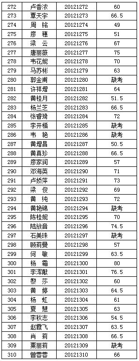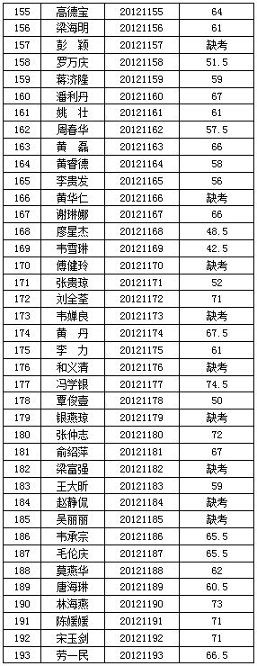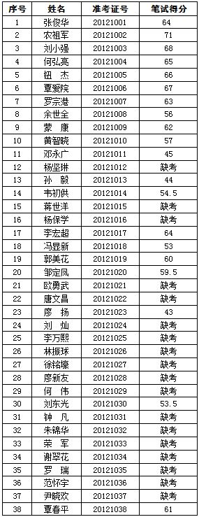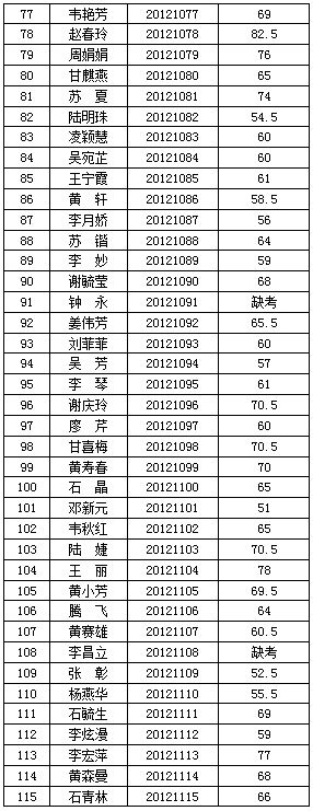 廣西交(jiāo)通(tōng)高級技工學校(91.com技師學院)2012年公開(kāi)招聘工作人員(yuán)筆試階段工作已經結束,按照《廣西壯族自治區(qū)事業單位公開招聘人員實施辦法》(桂人社(shè)發〔2011〕155號)要(yào)求及《91.com高級技工(gōng)學校(91.com技師學院)2012年公開招聘工作人員公告》的有關規定,現將本次公開招(zhāo)聘考試筆試成績公告如(rú)下: