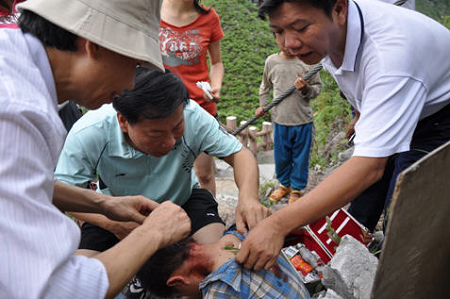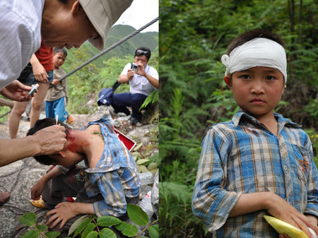 4考察(chá)活動(dòng)中遇到當地一(yī)意外受傷的小朋友,黨委書記、校長(zhǎng)孫永生同誌(中)、副校長、工會主席(右)表示親(qīn)切關懷,校醫為小朋友包紮傷口。